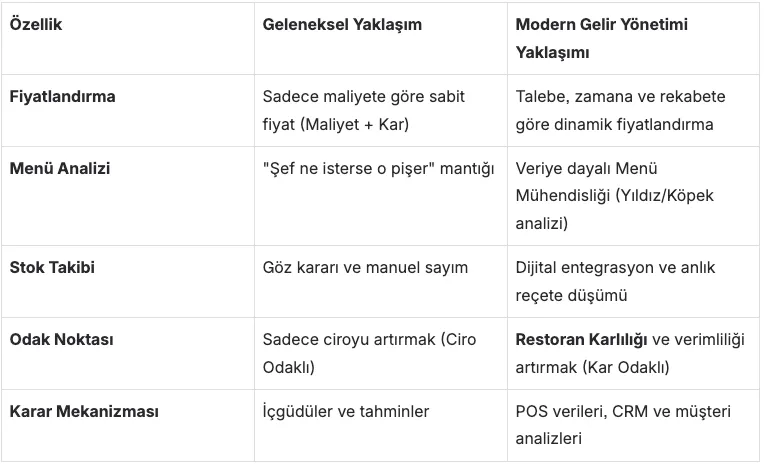 Aşağıdaki tablo, eski usul işletmecilik ile modern gelir yönetimi arasındaki farkı ve bunun Restoran Karlılığı üzerindeki etkisini net bir şekilde göstermektedir: