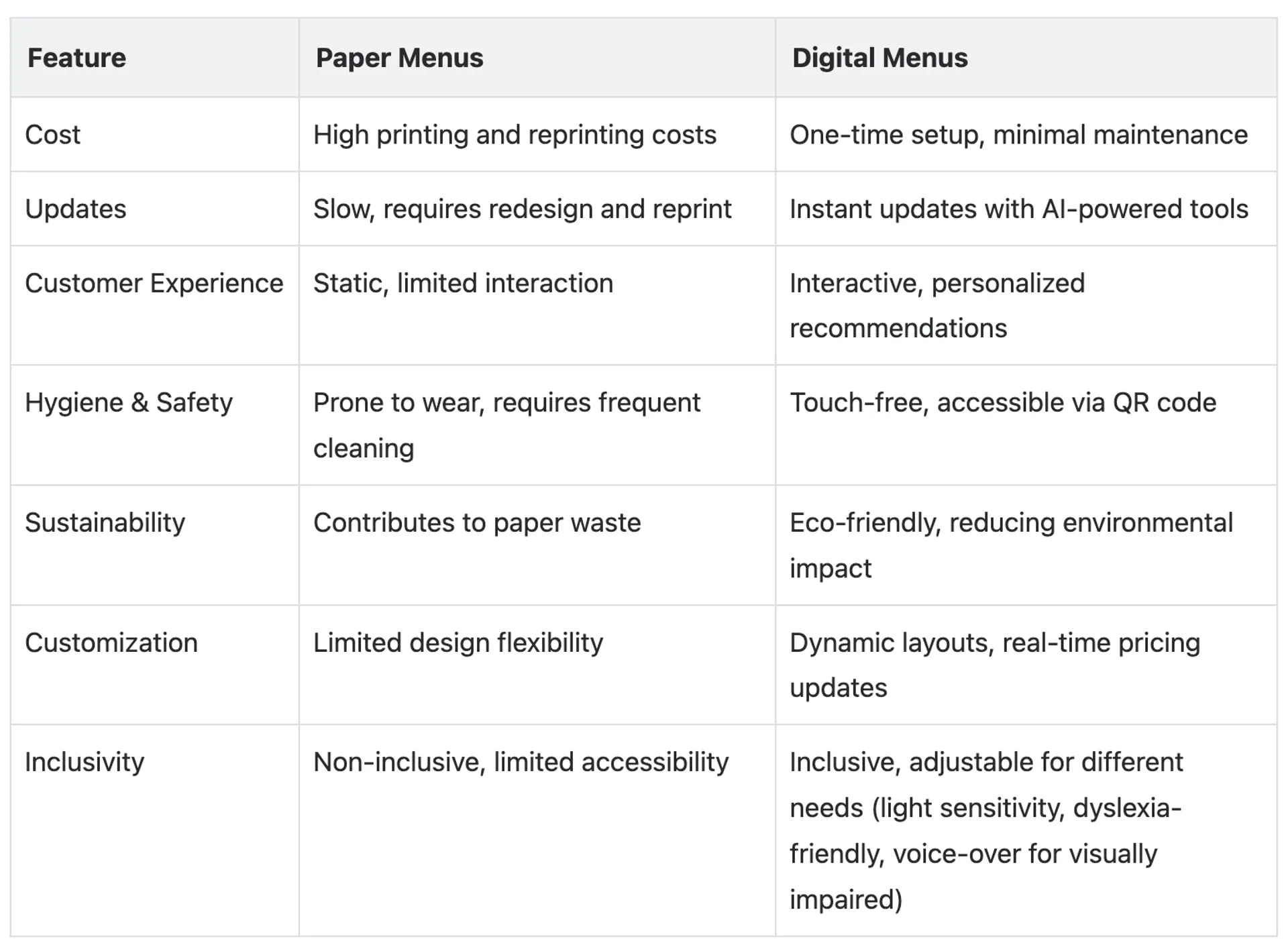 - Paper menus are old school, non-inclusive and limited.