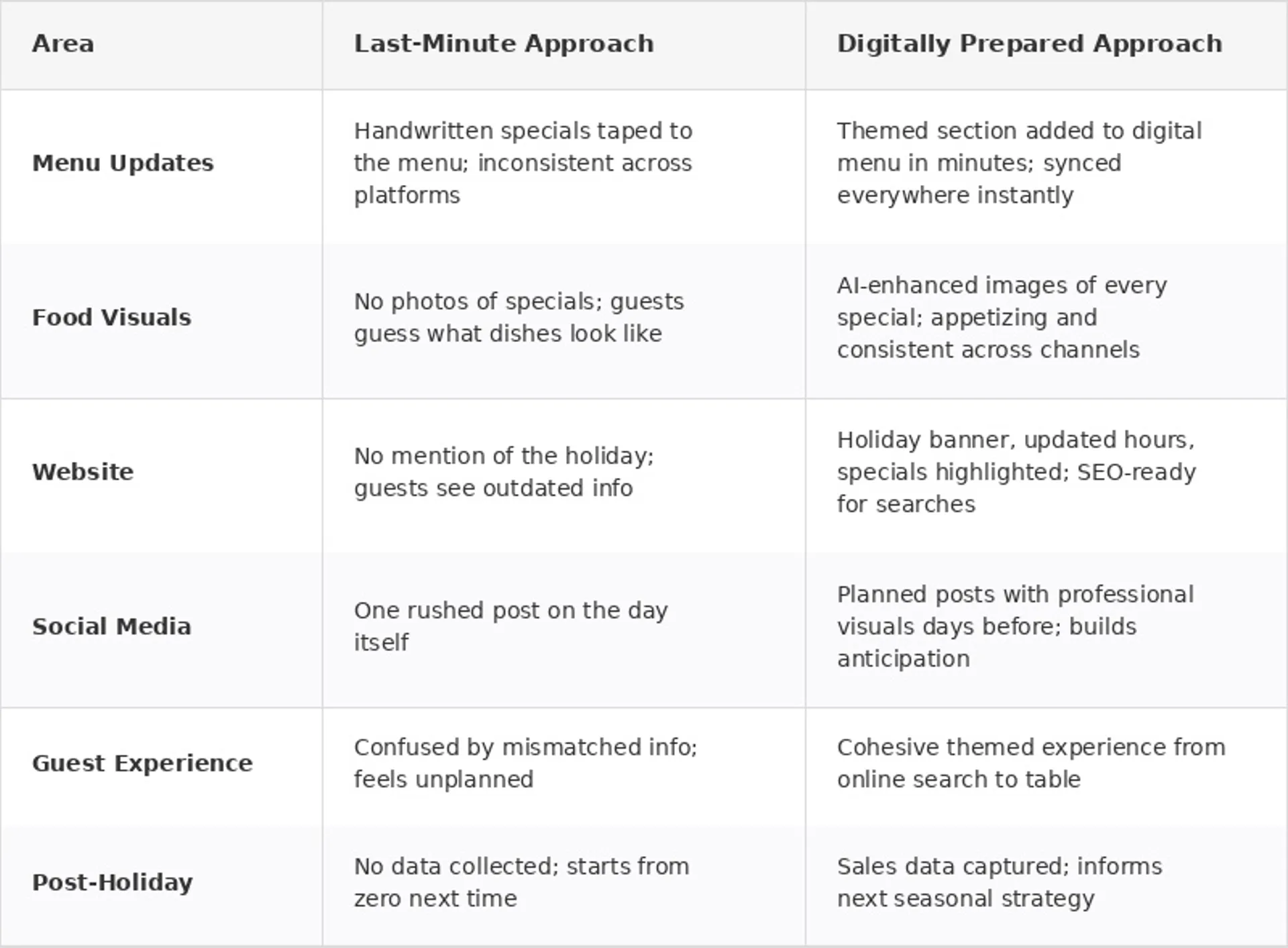 But preparation is everything. A themed menu without proper digital presentation is a missed opportunity. Beautiful specials without an updated website are invisible to the guests searching online. And a festive atmosphere without shareable visuals means your best marketing channel β your own customers β stays silent.
