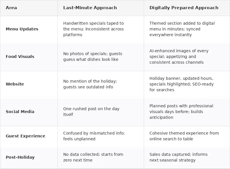 One of the biggest operational headaches during seasonal events is keeping your menu up to date across every platform. Your website says one thing, your delivery app says another, and your physical menu still shows last season's specials. This kind of inconsistency costs you real money through confused guests and missed orders.