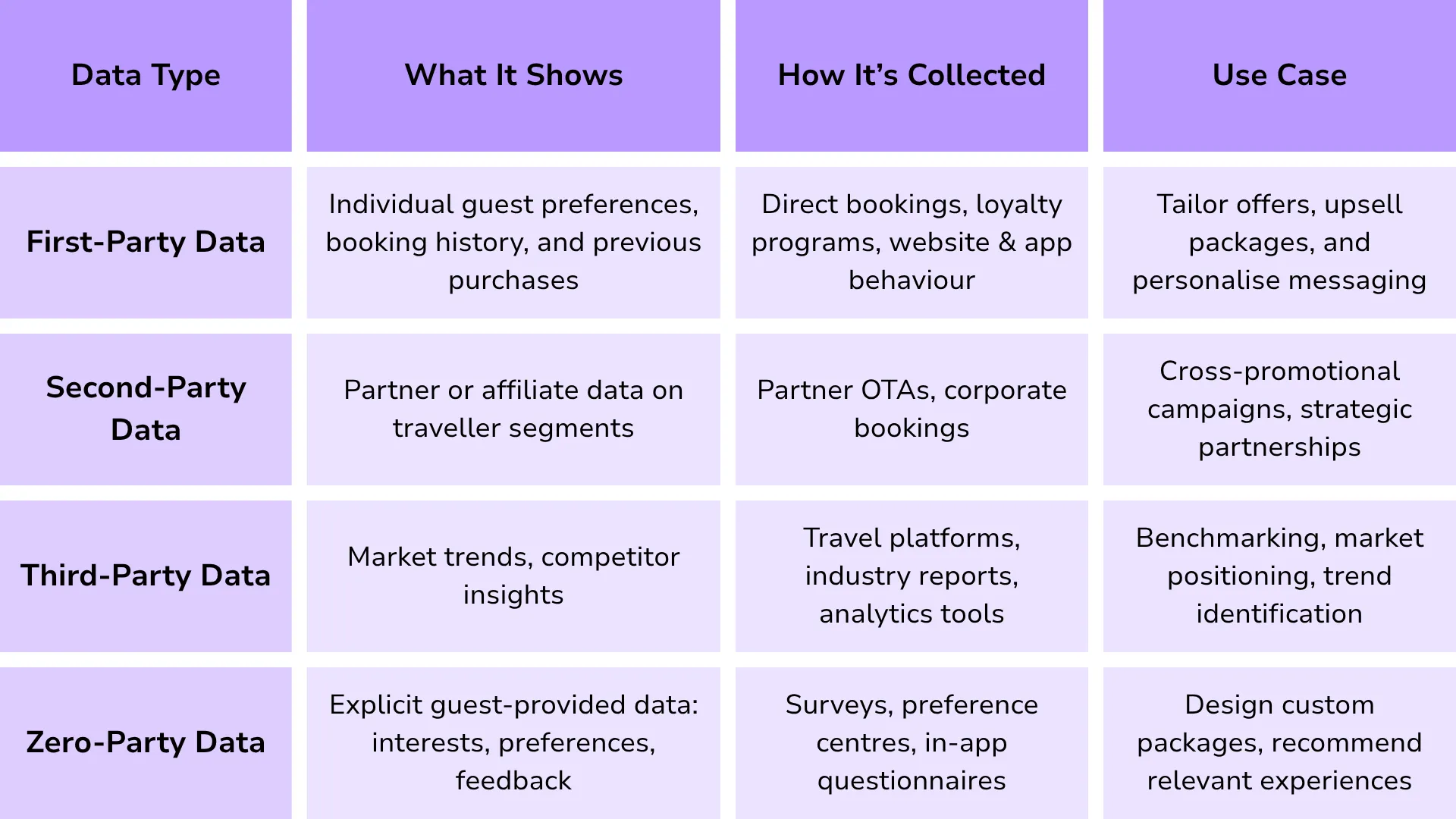By analysing a combination of first-party, second-party, third-party, and zero-party data, hotels can discover,