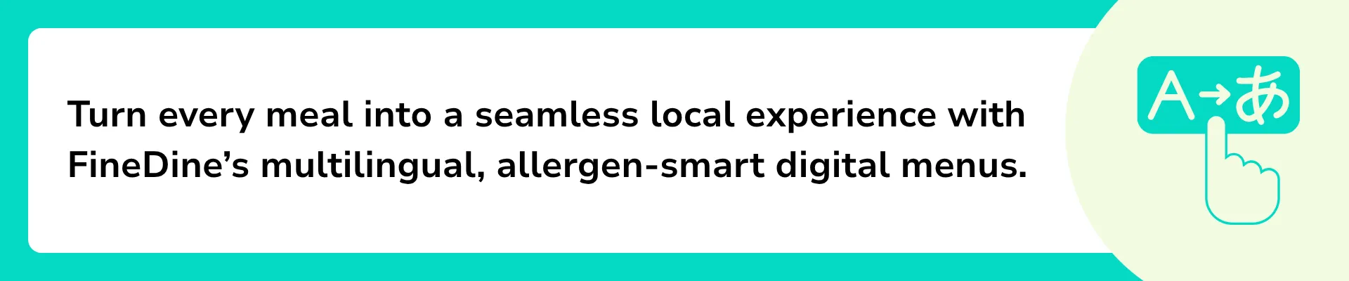FineDine’s digital menu tools offer a simple yet powerful way for travellers to discover and enjoy local dishes with confidence. Menus can instantly adapt to up to 40 languages, eliminating the frustration of guesswork and language barriers.