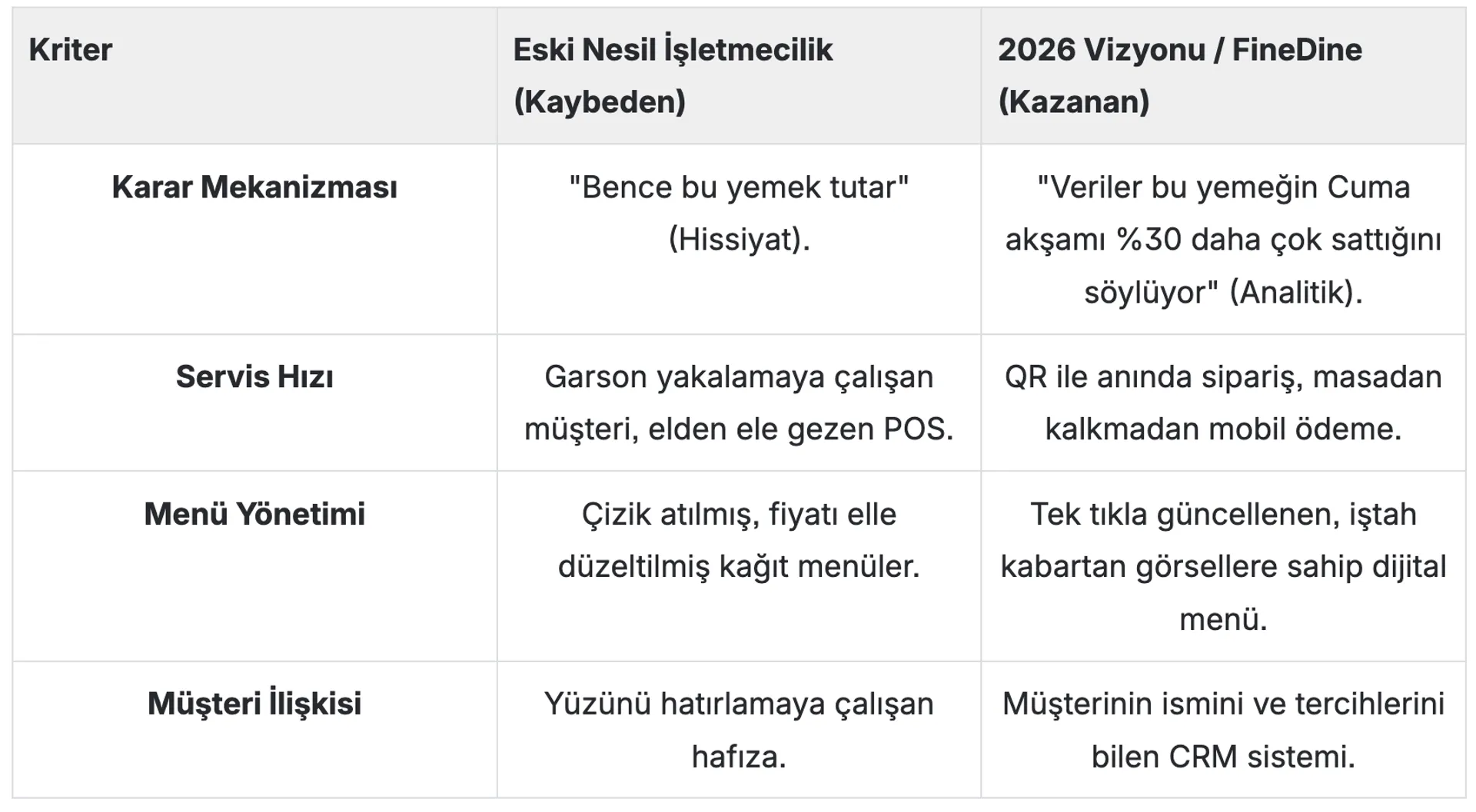 Eskiden en değerli şey şefin gizli tarifiydi. 2026'da ise en değerli şey müşteri verisi. Müşterin içeri girdiğinde onun vegan mı olduğunu, en son ne zaman geldiğini veya hangi şarabı sevdiğini biliyor musun? Bilmiyorsan, onu tanıyan (yani veriyi kullanan) rakibine kaptıracaksın.
