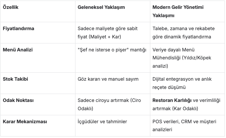 Aşağıdaki tablo, eski usul işletmecilik ile modern gelir yönetimi arasındaki farkı ve bunun Restoran Karlılığı üzerindeki etkisini net bir şekilde göstermektedir: