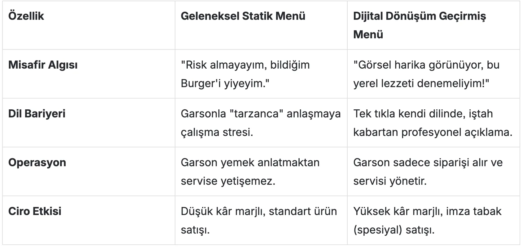 Aşağıdaki tablo, yerel lezzetlerde dijital dönüşüm hamlesinin misafir algısını nasıl değiştirdiğini net bir şekilde özetliyor: